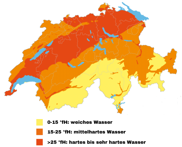 In der Schweiz haben wir grosse Regionen mit hartem oder sogar sehr hartem Wasser. Darunter fallen praktisch der ganze Kanton Aargau, der grosse Teile der Kantone Bern, Solothurn und Baselland sowie der nördliche Teil des Kantons Luzern.