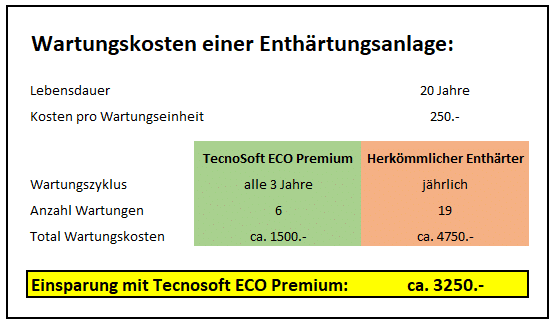 Bei der TecnoSoft Eco Premium ist dies nicht der Fall! Die Anlage desinfiziert sich regelmässig automatisch, und Silberharz wird keines verwendet. Eine kurze Funktionskontrolle alle drei Jahre reicht völlig aus. Sehen Sie selbst, welch enormen Effekt dies auf die Unterhaltskosten hat, welche über die Lebensdauer der Anlage anfallen.